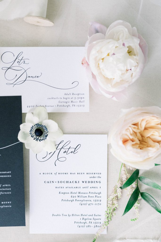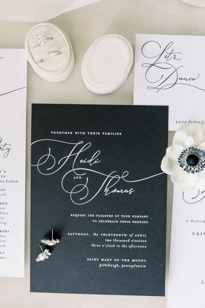Flowing script danced across the invitations letting their guests know this was a formal wedding with a fun reception waiting for them at the Carnegie Music Hall. An all black invitation with white text stood out against their white enclosure cards, creating a modern vibe their guests will never forget.