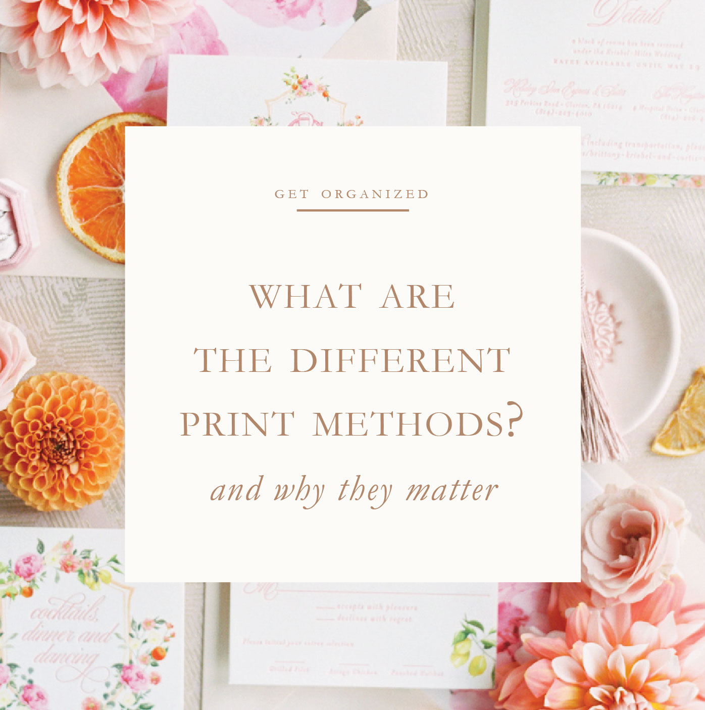 During our consultation I ask a lot of questions, including what print method you’re interested in.  Some clients come to me knowing exactly what they want but others have no clue what I’m talking about.  That’s totally fine – my job is to educate you – and today I’m going to break down all the different wedding invitation print methods I offer and what the difference is.