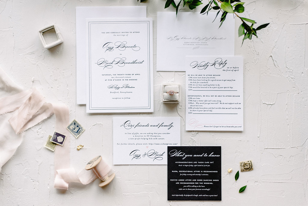 Amy and Mark wanted a clean, classic custom invitation suite that really reflected their fun, outgoing personality. They were hosting a weekend wedding at the Lodge of Glendorn and needed an information card to let their guests know what to expect about the weekend. Oversized reply cards let their personalities shine with a hilarious, question-style RSVP (I’m told their guests absolutely loved this touch!) while their main invitation did most of the talking: simple, understated, and luxurious. We kept with classic black and white letterpress with a kiss of pink to let the paper do all the talking.