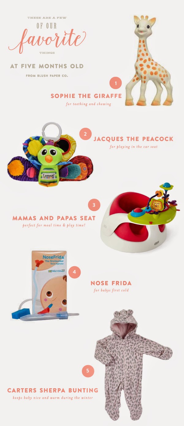 It’s hard to believe that our little peanut is five months old already, but she is. In fact, she’s a lot closer to six months now! In the last few weeks, she’s grown leaps and bounds and is so much more independent than she was even a month ago. She’s sitting up on her own and starting to crawl. Time is moving at warp speed and I wish it would slow down. She has so many preferences now and it’s amazing watching her personality emerge.  She has a strong preference for certain toys over others, and it’s incredible how different her choices are over her sisters – even when it comes to food!
