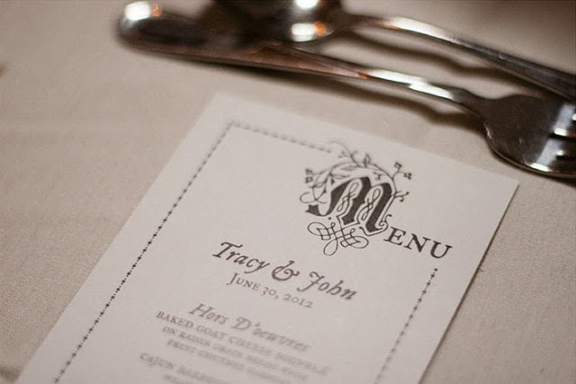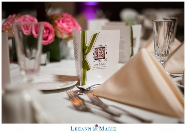 Her wedding suite was designed to look like an 18th century book.  Her 8 page program wedding ceremony program was side stitched and opened like a book.  Tying in with the wedding’s literary theme, guests enjoyed their dual entrée dinners at tables marked with the couple’s favorite love quote.