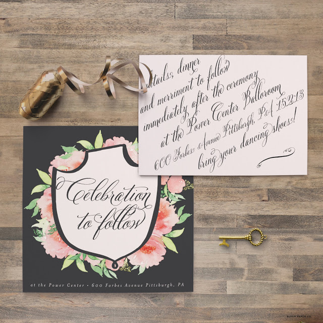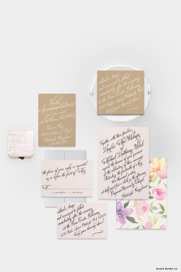 Amanda is the first design from my new 2016 wedding collection! This suite was inspired by classic calligraphy and includes simple typography, pastel colors and a floral envelope liner. It’s an excellent fit for a classic bride looking for an elegant, traditional wedding invitation suite but I can see it pairing well with an outdoor wedding as well. Amanda is shown here in ballet and charcoal, but I encourage all my brides to brand their weddings and choose their own custom colors!
