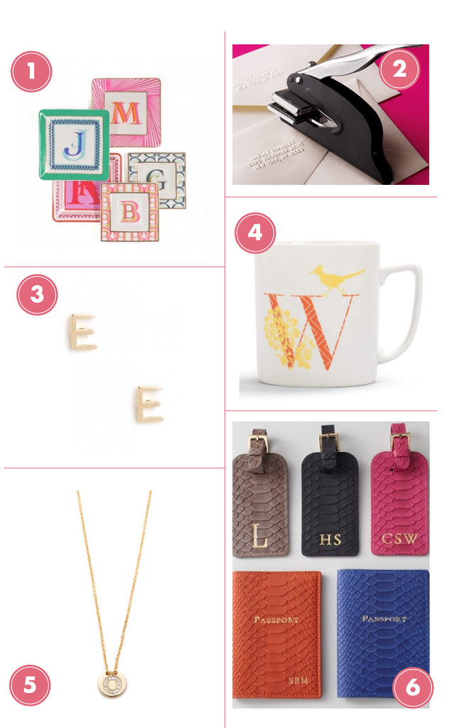 (1) decorating is as easy as A-B-C, at cwonder; (2) let’s emboss, at neiman marcus  (3) don’t forget your name, at baublebar; (4) personalized coffee mug, at cwonder ; (5) gorgeous monogram around your neck, at shopbop; (6) travel in style, at horchow