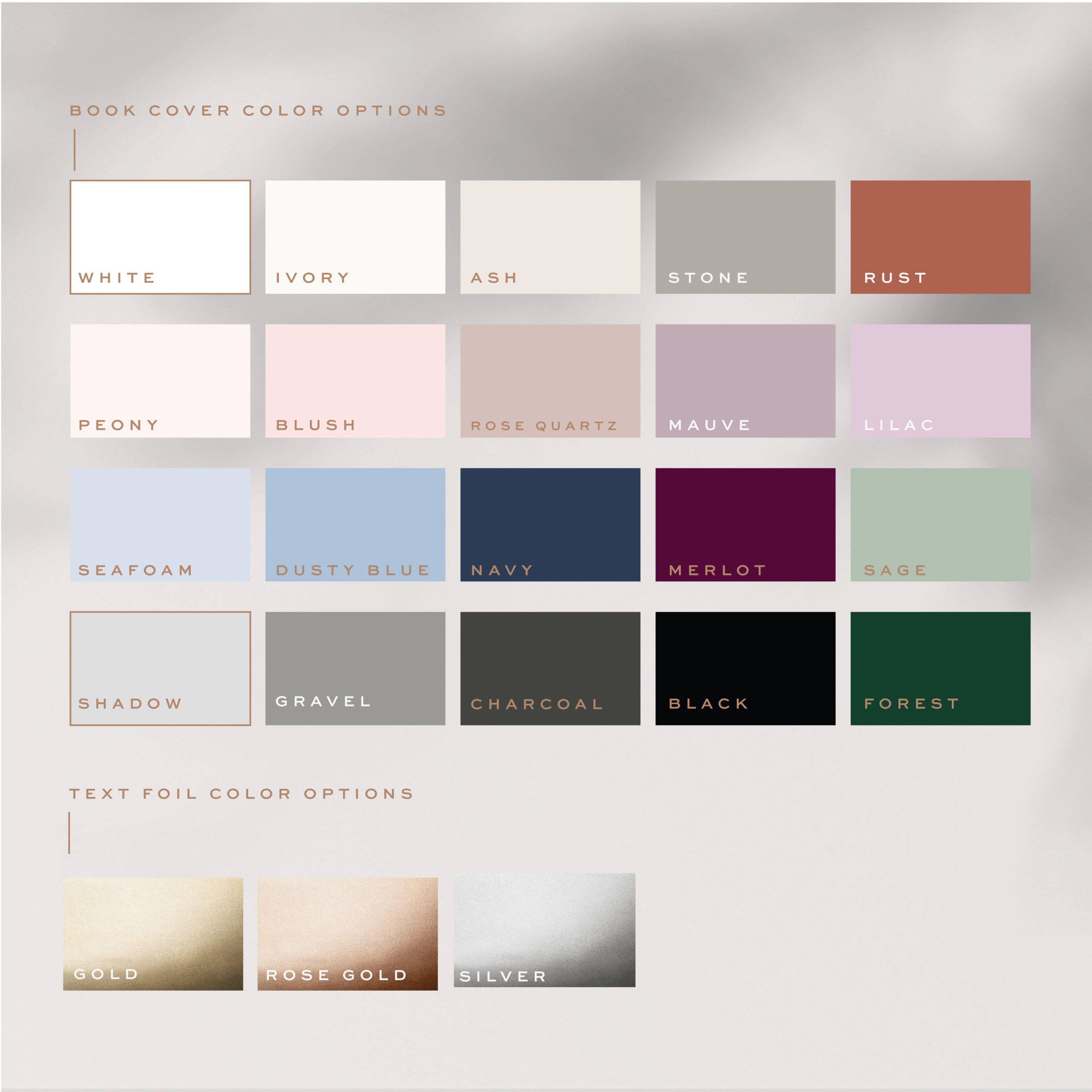 | Cover Color Book 1 | Ash, Black, Blush, Charcoal, Dusty Blue, Forest, Gravel, Ivory, Lilac, Mauve, Merlot, Navy, Peony, Rose Quartz, Rust, Sage, Seafoam, Smoke, Stone, White |