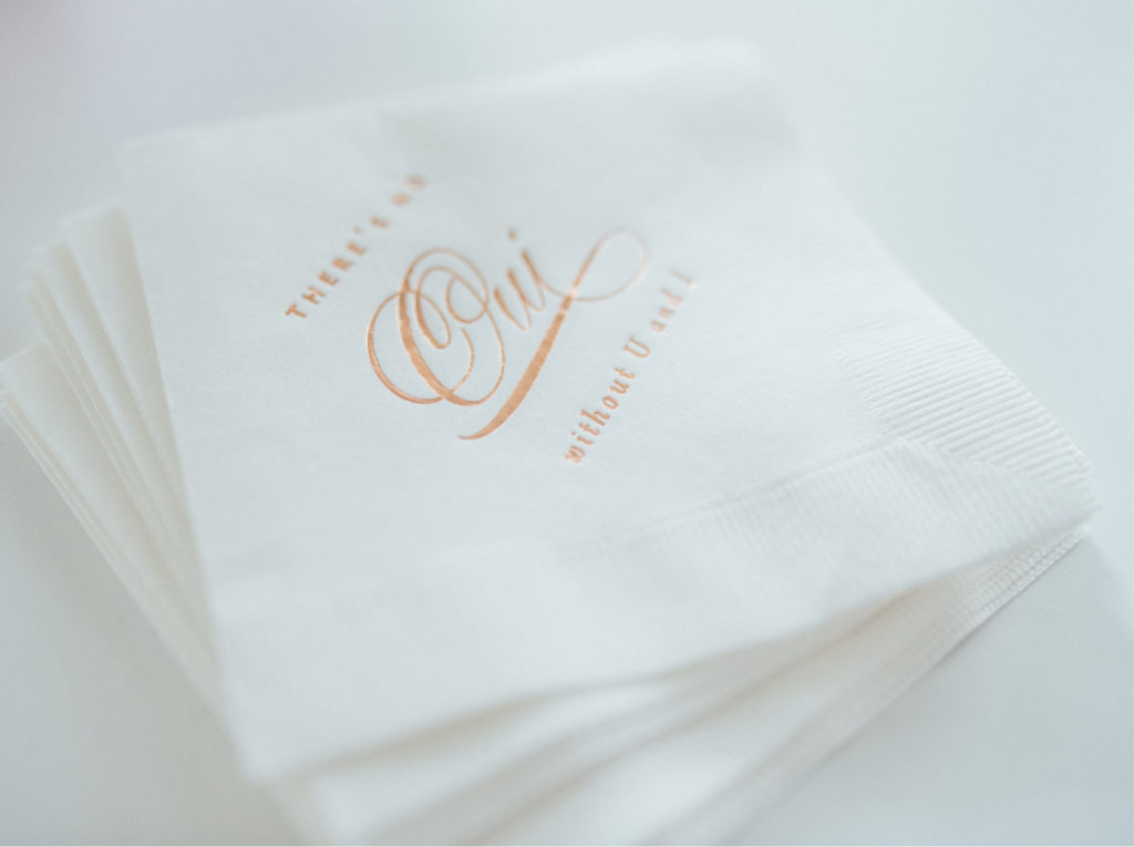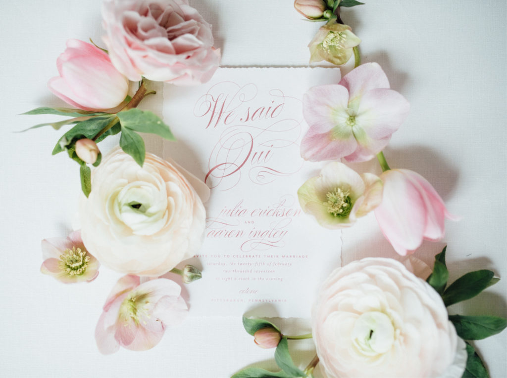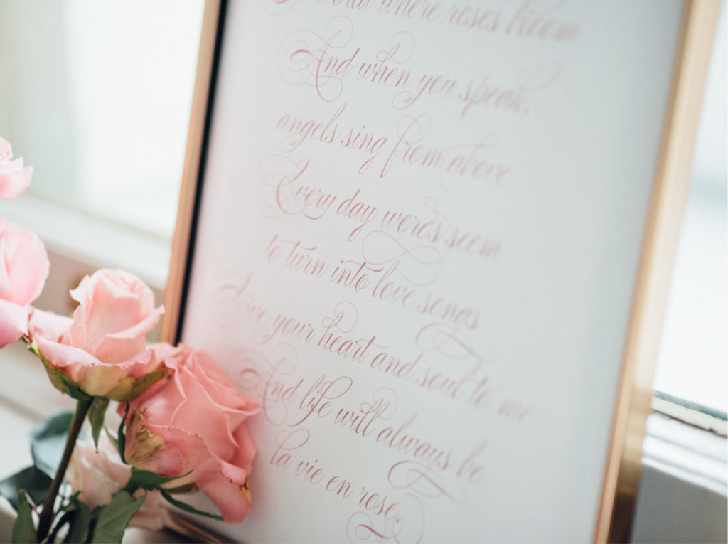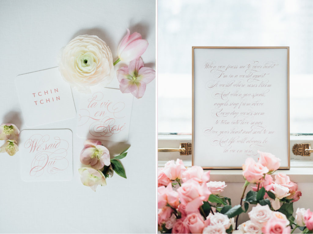 We created this monochromatic pink suite for the elevated cocktail party vibe, then added in deckled edging and rose gold foiling details on the napkins and coasters.  A large scale print was designed with our favorite lyrics, then framed in a (of course!) gold frame.  We drew inspiration from 1960 fashion magazines, our trusty pantone deck (do you know how many shades of pink there are?!), and the historical architecture of the Frick downtown.  This is the first event and styled shoot photographed in The Coterie and we were honored to be a part of it!