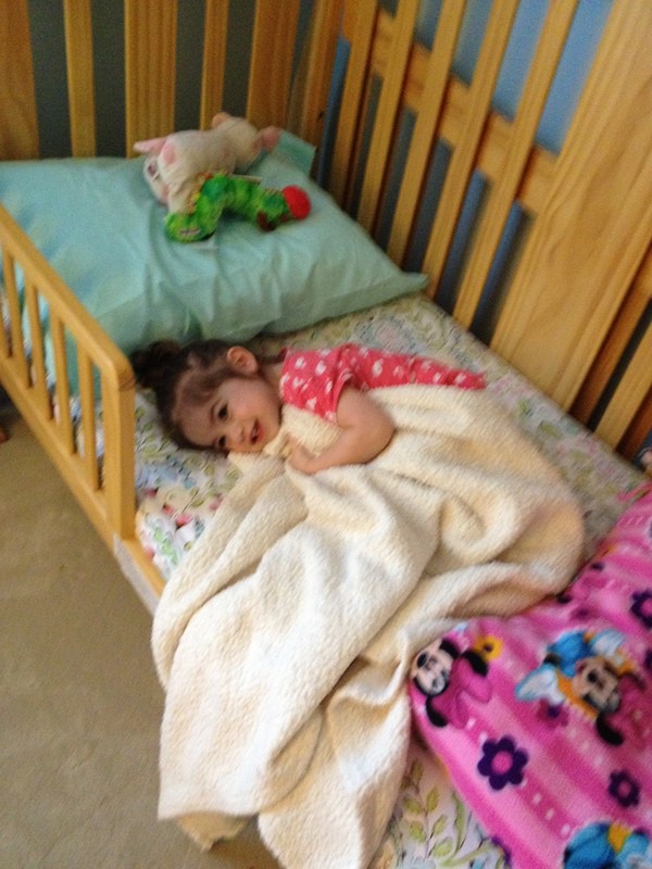 Last week, Little Miss Jailbreak decided that cribs were for suckers.  We’d been struggling with bedtime for the last three weeks, mostly due to teething issues. Chloe is getting her two year molars, and I get that they hurt. It’s making bedtime harder and harder for her and for us and she’s been resisting sleep and trying to climb out of her crib. But last week?  She piled her blankets in a corner, smooshed them together and used them as a sort of step stool to climb out of the crib.  High five for being creative, but goodbye blankets.